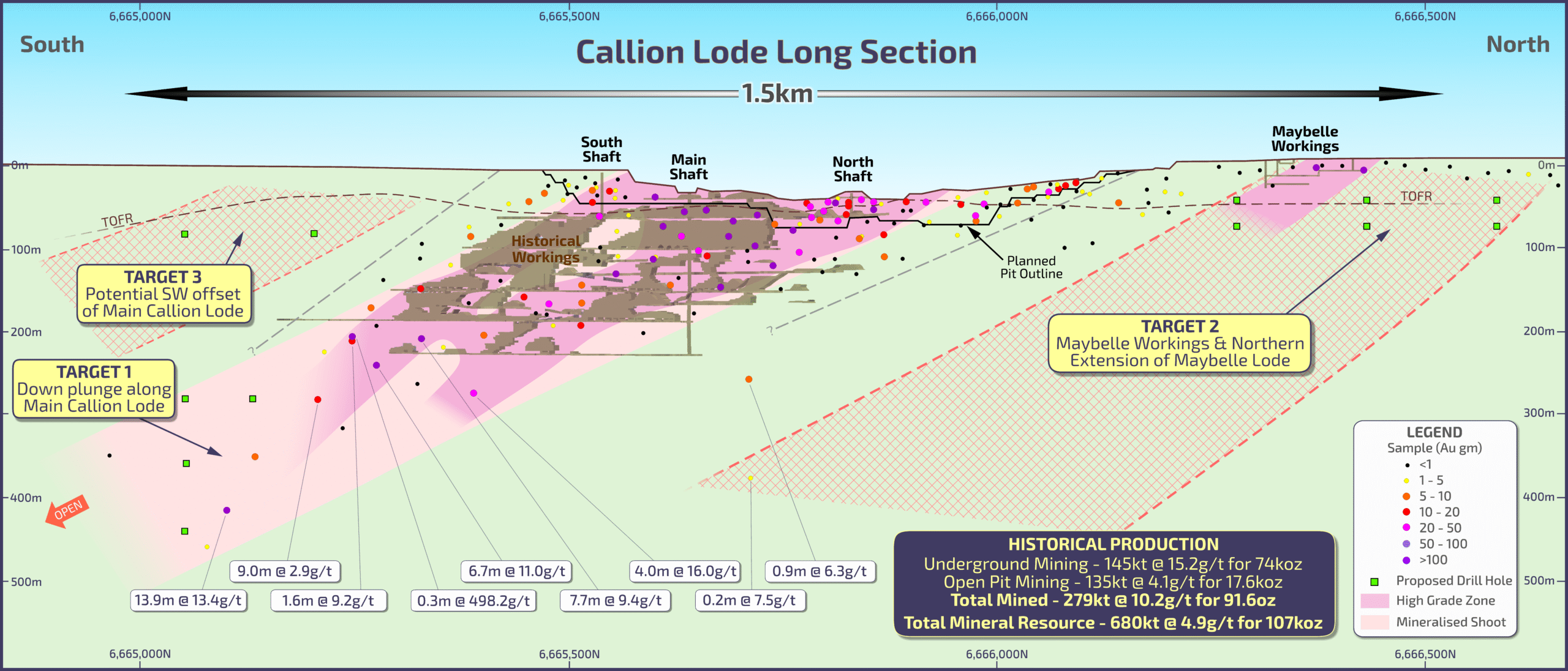 Recent pit mapping and core relogging have started to unlock the controls of the high grade mineralisation with the intersection of the quartz host, fold hinges and north-south shears. Drill programs are in place to target the down plunge of the Callion lode as well as along strike to the north and south.