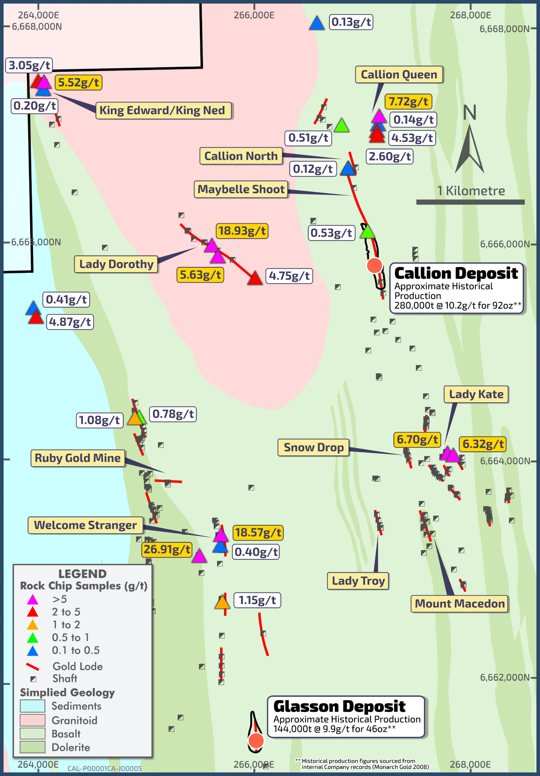 Mapping and rockchip sampling has identified a number of high priority targets within the Greater Callion area with work continuing to further delineate the geological and structural settings of these gold occurrences which will aid drill program design.