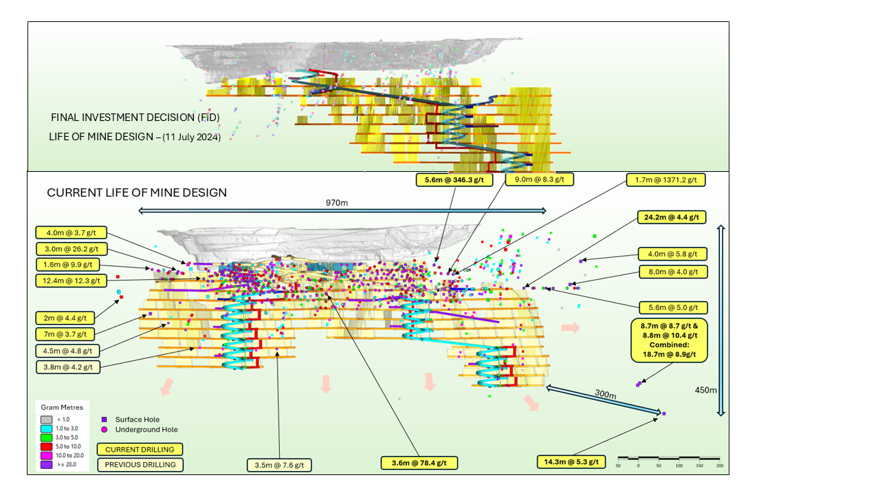Drilling has already defined a high-grade mineralised strike length of over 1.3km, with the deepest hole returning 14.3m @ 5.3g/t and 18.7m @ 8.9g/t at depths of over 450 metres from surface depth. Mineralisation remains open both along strike and at depth.